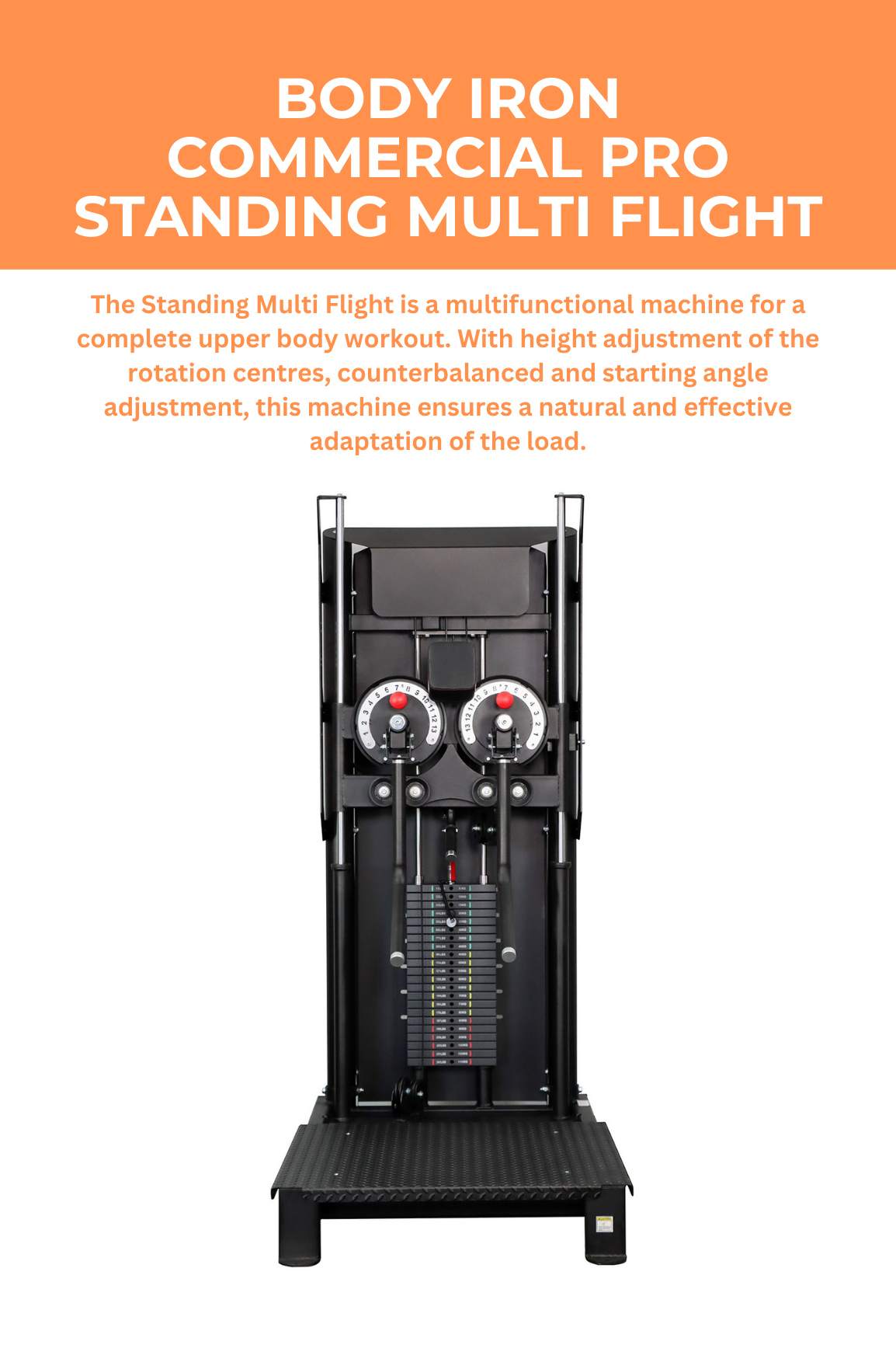The Standing Multi Flight is a multifunctional machine for a complete upper body workout. With height adjustment of the rotation centres, counterbalanced and starting angle adjustment, this machine ensures a natural and effective adaptation of the load.