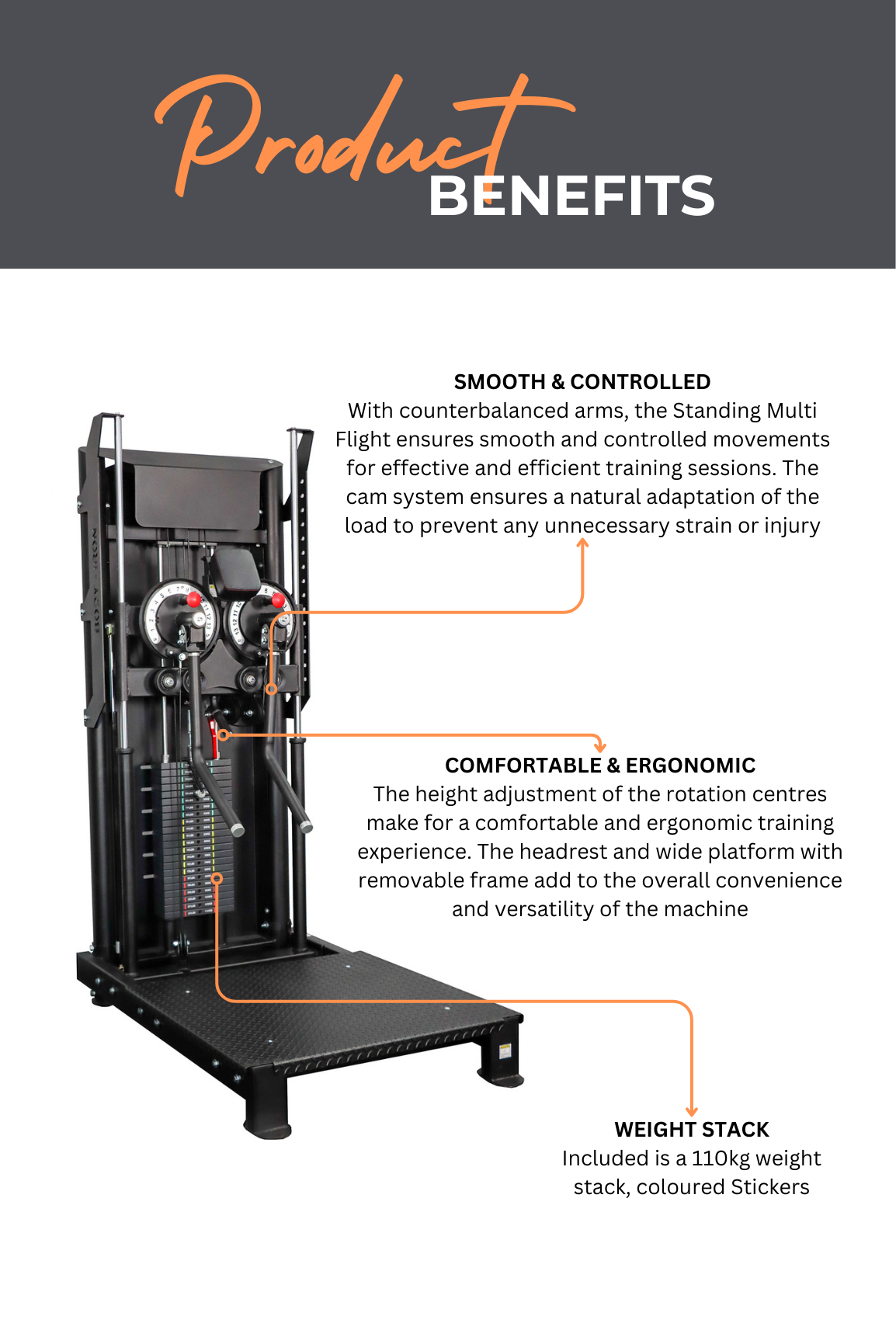 With counterbalanced arms, the Standing Multi Flight ensures smooth and controlled movements for effective and efficient training sessions. The cam system ensures a natural adaptation of the load to prevent any unnecessary strain or injury.